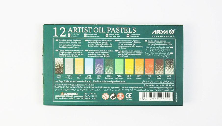 سری آرتیست محصولات آریا مناسب نقاشی حرفه ای می باشد. ترکیبی از رنگدانه، چسب موم و نوعی روغن غیر قابل خشک شدن استفاده روکش کاغدی مداد شمعی برای جلوگیری از سر خوردن پاستل در دست است. بهداشتی و غیر سمی نرم و کیفیت بسیار خوب