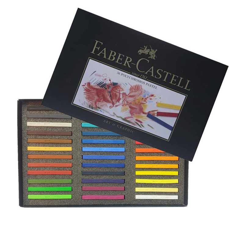 یکی از ابزار پرطرفدار نقاشی پاستل است که در دو نوع گچی و روغنی تولید میشود. برند مشهور «فابرکاستل»(FaberCastel) که سابقه ای طولانی در زمینه ی تولید لوازم هنری و لوازم تحریر دارد، پاستل مدل پلی کروموس را تولید و به بازار جهانی عرضه کرده است. 36 رنگ متنوع در این بسته قرار دارد که می تواند برای خلق یک تابلوی بی نظیر کافی باشد. این پاستل از نوع گچی است و قابل استفاده روی مقوا، مخمل، کاغذ و بوم است. رنگ های پاستل گچی پلی کروموس فابرکاستل بسیار درخشان و اصیل هستند و به راحتی با یکدیگر قابل ترکیبند. این پاستل های گچی برای هنرمندان در تمام سطوح ایدئال و مناسب است. پس از پایان یافتن اثر، حتماً باید از یک اسپری تثبیتکننده روی آن استفاده شود تا عمر و دوام طولانی پیدا کند. فابرکاستل کیفیتی اثبات شده و مورد قبول برای تمام هنرمندان دارد.