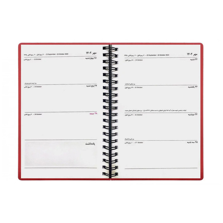 این سررسید در صفحات ابتدایی خود یک جدول ضمیمه که دارد که در آن مناسبت های مختلف درج شده است. همچنین دو جدول شش ماهه در دو صفحه مجزا در یک نگاه سال شمس و میلادی را در اختیارتان قرار می دهد. علاوه بر آن صفحه تعطیلات رسمی نیز به شما یک دید کلی از تعطیلات سال می دهد. در صفحات پایانی نیز جداولی به تفکیک ماه برای ثبت مناسبت های شخصی، جدول ماهانه مسافرت ها، یادداشت هزینه ها، آدرس ایمیل ها، ثبت نام اشخاص و اطلاعات تماسشان و در انتها تعداد زیادی برگه برای یادداشت وجود دارد.