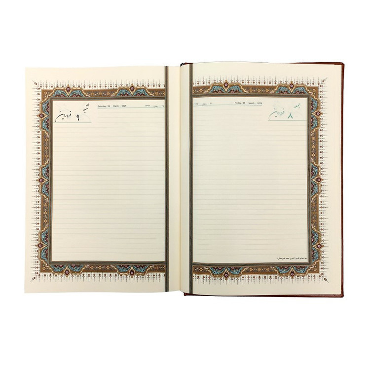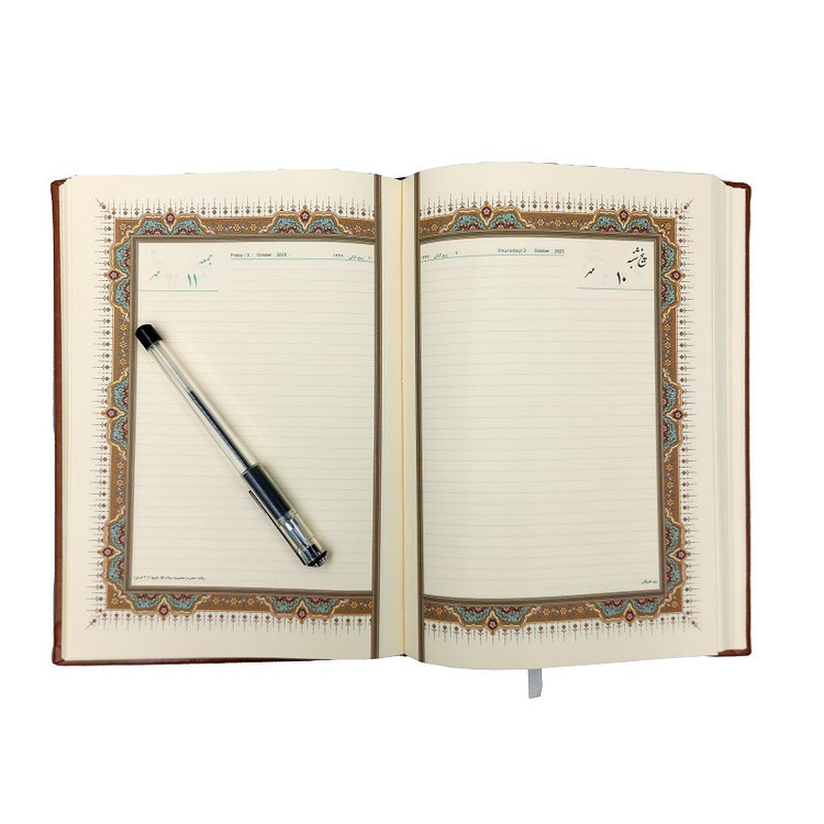 سالنامه سال 1404 با طرح چرم و طراحی سنتی روی جلد، محصولی جذاب و کارآمد برای سازماندهی روزانه شماست. این سالنامه به ویژه برای افرادی که به طراحیهای سنتی و اصیل ایرانی علاقهمند هستند، بسیار مناسب است. ### ویژگیهای محصول: - **جنس جلد:** جلد چرم با کیفیت بالا که علاوه بر زیبایی، دوام و ماندگاری بیشتری دارد. - **طراحی جلد:** طراحی سنتی که حس و حال فرهنگی و تاریخی را به همراه دارد. - **صفحات داخلی:** صفحات داخلی با طراحیهای ابر و بادی که به آن زیبایی و ظرافت خاصی میبخشد. - **جداکنندهها:** وجود جداکنندههای مخصوص برای تفکیک بخشهای مختلف سالنامه، که به شما کمک میکند تا اطلاعات و یادداشتهای خود را بهتر سازماندهی کنید. این سالنامه نه تنها به عنوان یک ابزار کاربردی برای برنامهریزی و مدیریت زمان عمل میکند، بلکه به عنوان یک اثر هنری نیز میتواند مورد استفاده قرار گیرد.