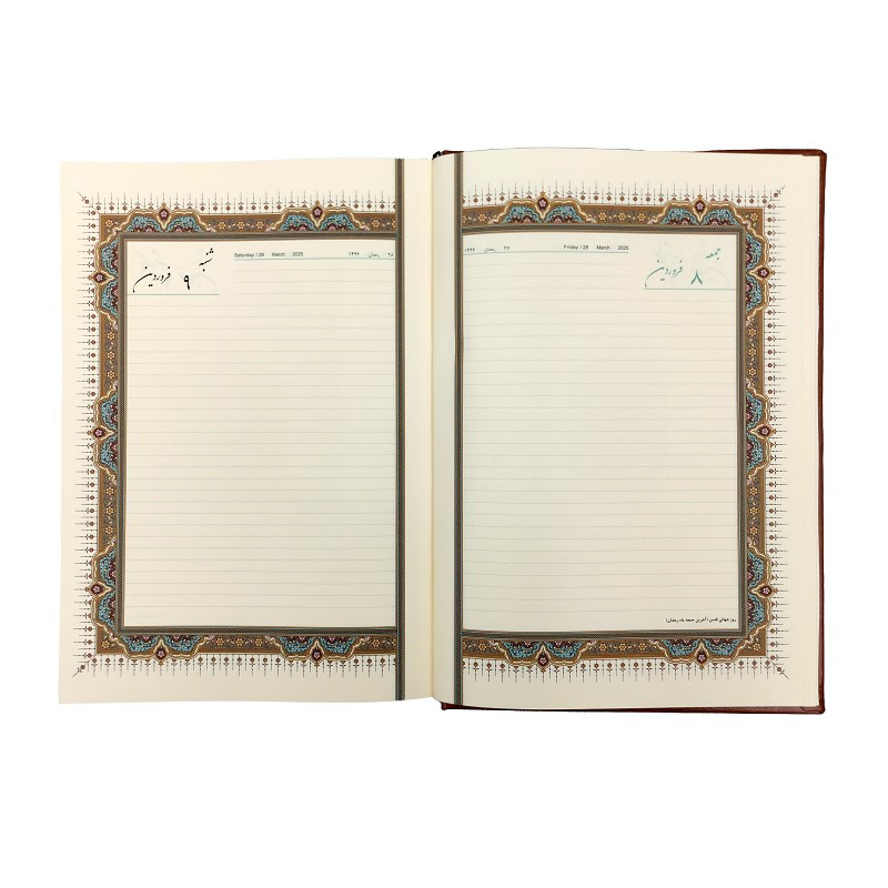 سالنامه سال 1404 با طرح چرم و طراحی سنتی روی جلد، محصولی جذاب و کارآمد برای سازماندهی روزانه شماست. این سالنامه به ویژه برای افرادی که به طراحیهای سنتی و اصیل ایرانی علاقهمند هستند، بسیار مناسب است. ### ویژگیهای محصول: - **جنس جلد:** جلد چرم با کیفیت بالا که علاوه بر زیبایی، دوام و ماندگاری بیشتری دارد. - **طراحی جلد:** طراحی سنتی که حس و حال فرهنگی و تاریخی را به همراه دارد. - **صفحات داخلی:** صفحات داخلی با طراحیهای ابر و بادی که به آن زیبایی و ظرافت خاصی میبخشد. - **جداکنندهها:** وجود جداکنندههای مخصوص برای تفکیک بخشهای مختلف سالنامه، که به شما کمک میکند تا اطلاعات و یادداشتهای خود را بهتر سازماندهی کنید. این سالنامه نه تنها به عنوان یک ابزار کاربردی برای برنامهریزی و مدیریت زمان عمل میکند، بلکه به عنوان یک اثر هنری نیز میتواند مورد استفاده قرار گیرد.
