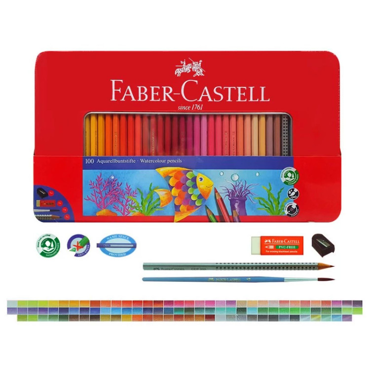 مداد آبرنگی 100 رنگ کلاسیک فابر به همراه همراه پاک کن و تراش و قلم مو